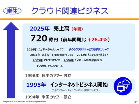 クラウド関連ビジネスについては、Webサービスの利用者数が2025年には490万人に拡大した。売上高は720億円で、「クラウド関連ビジネスを行っている企業と比較しても遜色(そんしょく)ない規模となっている。当社がインターネットビジネスを開始したのは1995年で、ヤフーの日本法人設立前のことになる。実はインターネットビジネス黎明(れいめい)期からネットビジネスを展開してきた企業でもある」と、クラウドやWebサービスでも実績を持ち、売上も伸びていることを訴えた。