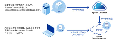 紙の文書をエプソンの複合機でスキャンし、Epson Connect経由で直接クラウドにアップロードが可能。PDFなどの電子文書も、Webブラウザーでドラッグ&ドロップするだけで登録できる。