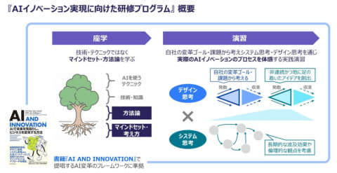 研修プログラムで展開するマインドセットや考え方、方法論は、「AI AND INNOVATION」に準拠し、同書の翻訳に携わったメンバーが研修プログラムをデザインしており、グローバルな先端知見とコンサルティングの知見を融合した効果的な内容となっている。