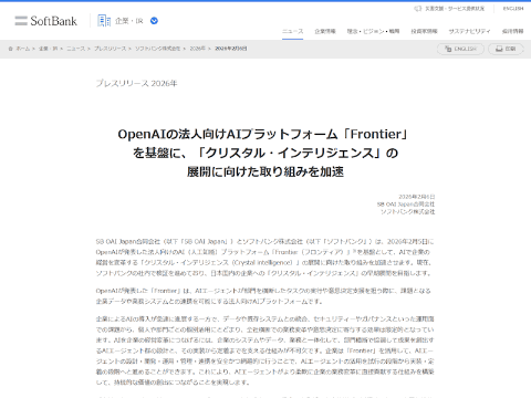 SB OAI Japan合同会社とソフトバンク株式会社は6日、OpenAIが発表した法人向けのAIプラットフォーム「Frontier」を基盤として、AIで企業の経営を変革する「クリスタル・インテリジェンス」の展開に向けた取り組みを加速させると発表した。現在、ソフトバンクの社内で検証を進めており、今後は日本国内の企業へのクリスタル・インテリジェンスの早期展開を目指すとしている。