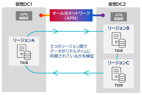 検証では、APNを利用し、70km圏内の接続を想定した2つの仮想データセンターと3つのリージョンを構築してデータ分散処理の動作を検証した。仮想データセンターに置く分散型データベースには、高い可用性と拡張性を備えたオープンソースの分散型SQLデータベースのTiDBを選択した。TiDBは、データを小さな単位に分割して複数のデータベース間で複製し、更新時には全てのデータベース間で整合性を保ちながら自動的に同期する点を特徴とする。