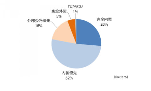 国内企業のアプリケーション開発を担当またはマネジメントする人を対象に、アプリケーション開発の基本方針を確認したところ、外製指向(「外部委託優先」と「完全外製」の和)の企業は21%であったのに対し、内製指向(「完全内製」と「内製優先」の和)は78%に上り、企業の内製化意欲が高い結果となった。これは、企業が外部委託に限界を感じ、内部での開発力を育成し始めていることを顕著に示していると分析している。