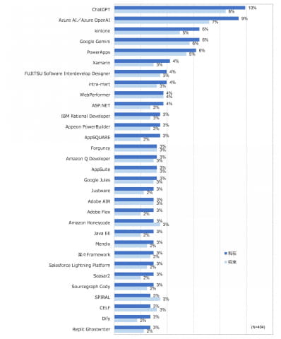 従業員数100人以上で市民開発を実施している企業に、市民開発に利用しているフレームワーク/ツール/サービスのうち、自社にとって重要なもの(最大3つ)を尋ねた質問では、最も多い回答は「ChatGPT」となり、次いで「Azure AI/Azure OpenAI」「kintone」「Google Gemini」「Power Apps」が上位に並んだ。従来、市民開発には「kintone」や「Power Apps」などのローコード/ノーコードツールが利用されることが多いが、近年AI技術の急速な進化を反映し、ChatGPTをはじめとするAI系のツールが市民開発の現場でも採用されているとしている。