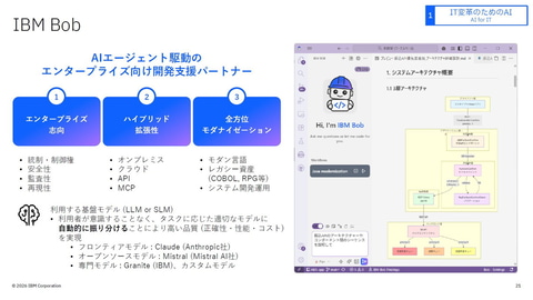 村田副社長は、「IBM Bobは、エンタープライズ指向、オンプレミスとクラウドによるハイブリッドの拡張性、レガシー資産にも対応する全方位モダナイゼーションという特徴を持つ。重要システムでの活用を前提としており、基幹システムなどにおいても統制と制御を行い、APIやMCP連携による拡張性も持つ。モダン言語だけでなく、COBOL、RPGなどのレガシー言語にも対応する。フロントモデルのClaude、オープンソースモデルのMistral、IBMが提供する専門モデルのGraniteなど、さまざまな基盤モデルを自動的に使い、開発者はシステム開発に集中することができる。IBM Bobは、COBOL、RPG、DevOps、Javaのモダナイゼーションという4つの領域で力を発揮する。IBMの思想が反映されたツールだといえる」などとした。