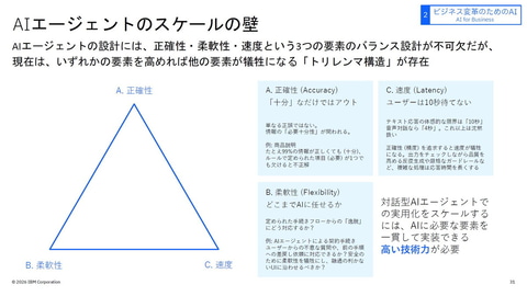 その一方で、AIエージェントが持つ「スケールの壁」についても指摘。「AIエージェントの設計には、正確性、柔軟性、速度という3つの要素のバランス設計が不可欠だが、現時点では、いずれかの要素を高めれば、ほかの要素が犠牲になる『トリレンマ構造』が存在する」と指摘する。