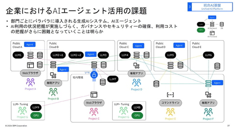 村田副社長は、「企業におけるAIエージェント活用の課題は、部門ごとにバラバラに導入されることで発生する生成AIシステムやAIエージェントの野良化にある。データ侵害が発生したときに監査証跡がなかったり、どのLLMにアクセスしたかがわからなかったりといった課題が発生することになる。これに対応するために、日本IBMでは、統合AI基盤を構築する。すでに、金融業、公益、製造業で先行プロジェクトを推進している」と語る。