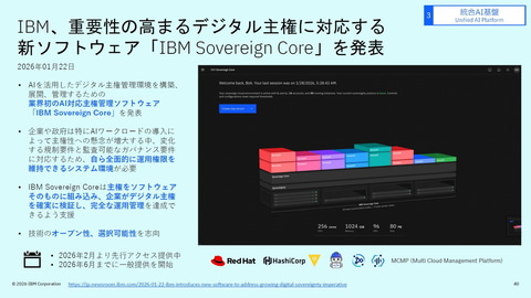 IBMでは、新たなソフトウェアとして「IBM Sovereign Core」を発表。これにより、重要性の高まるデジタル主権に対応することができるという。現在、先行アクセスを提供しており、2026年半ばには一般提供を開始するという。「日本では数社のITサービスプロバイダーと議論を開始しているところである」という。