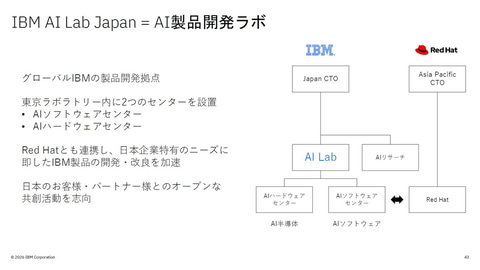 IBM AI Lab Japanは、グローバルで展開するIBMの製品開発拠点のひとつで、約400人が在籍。東京ラボラトリー内に、IBM Sovereign Coreの開発を行う「AIソフトウェアセンター」と、次世代のAI半導体の開発を行う「AIハードウェアセンター」の2つのセンターを設置している。