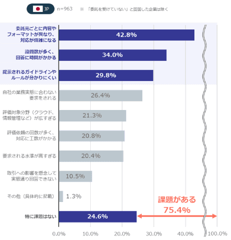 取引先(委託元)から求められるセキュリティ評価(アンケート回答など)について尋ねた質問では、委託を受けていない企業を除く75.4%の企業が何らかの課題を感じていると回答した。最大の課題は、「委託元ごとに内容やフォーマットが異なり、対応が煩雑になる」(42.8%)ことで、現場では非効率な業務負荷が増大しており、評価基準の標準化が強く求められているとしている。