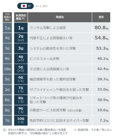 セキュリティの脅威に対する企業の警戒度合いを調査するため、独立行政法人情報処理推進機構(IPA)が2025年1月に公表した「情報セキュリティ10大脅威 2025」の組織編で発表された10の脅威のうち、実際に企業のセキュリティ担当者が警戒している項目について、日本企業に尋ねた。1位は「ランサムウェアによる被害」(80.8%)で、依然として最大の脅威と認識されている。