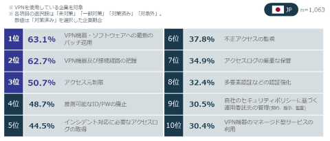 さらに深刻なのは対策状況で、「最新のパッチ適用」を完了している企業は63.1%にとどまったことから、4割近くの企業は対策が未完了の状態であり、脆弱性を放置している恐れがあると指摘する。VPN機器の脆弱性を突く攻撃が常態化しているにもかかわらず、基本的なメンテナンスさえ追いついていない状況下で、現場ではVPNの利用を続けているという、極めて危険な状態が浮き彫りになったとしている。