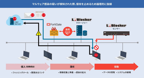 今回提供される「L2Blocker × FortiGate連携機能」では、社内に設置されたFortiGateがC&Cサーバーへの通信をはじめとする不審な通信やマルウェア感染の疑いを検知した際に、その情報をL2Blockerに連携することで、該当端末を即座にネットワークから遮断する。