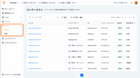 また、「センサーホスト」画面のリリースにより、Cloudbase上で全てのSensorの稼働状況を一覧で確認できるようになった。各Sensorに対してタグを付与することで、資産台帳とのひも付けや部署情報の管理など、組織固有の情報を柔軟に管理できる。