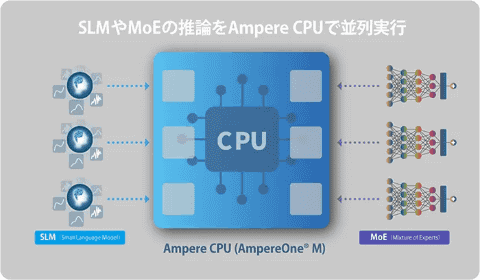 共同検証では、ソフトバンクが開発を進めている、計算資源の管理やAIモデルの最適な配分を行うオーケストレーターと、AIの推論処理向けに設計されたAmpere製のCPUを活用することで、CPUをAI推論用の計算資源として利用できることを確認した。AIエージェントなどで一般的に利用されるSLM(Small Language Model:小規模言語モデル)や、推論の際に一部の専門家(Expert)のみを動作させて計算処理の負荷を抑えるMixture of Experts(MoE)などの推論モデルをCPU上で実行し、AIモデルの運用を最適化することで、計算資源の利用効率向上を実現できるとしている。