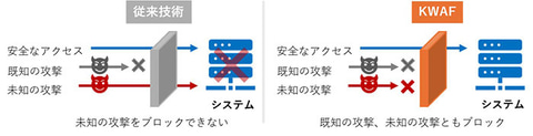 KWAFは、システムのアクセスログからホワイトリストを自動生成することで、誤検知率を抑制しつつ未知のサイバー攻撃を止められるセキュリティ技術。従来のホワイトリストによる検知法は、未知のサイバー攻撃に対して有効であるものの、防御対象となるシステムごとに正確なホワイトリストを作成し、システムの変更に合わせてリストを更新し続ける必要があった。しかしKWAFでは、2つの技術を組み合わせることでホワイトリスト方式の課題を解決したという。