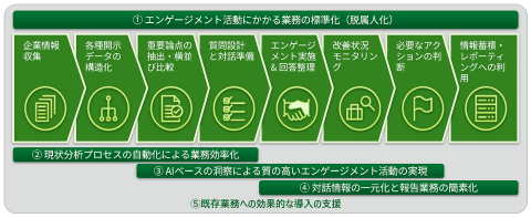 現状分析プロセスの自動化による業務効率化が可能で、業務プロセス中の複数の関連部署にまたがるESG情報の収集から分析、対話準備までの業務をAIが支援し自動化する。作業の重複や手作業を減らし効率化する。