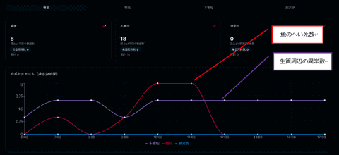また、養殖生け簀周辺に高さ2mの監視カメラを設置することで、カメラ1台あたり生け簀4台の撮影を実現した。撮影した動画をLAplustが開発した画像認識AI「LA-Eye」で解析することで、魚のへい死や生け簀周辺の異常の検知に成功した。