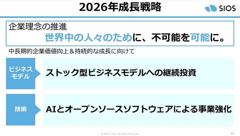 テクノロジー面では、AIとオープンソースソフトウェア(OSS)による事業強化を進める。喜多氏は「AIは多くの企業が取り組んでいるが、当社は強みであるOSSとの組み合わせで差別化を図る」と強調。自社製品へのAI機能搭載を継続するほか、コンサルティングやシステムインテグレーションの領域でも顧客のAI導入・活用支援を一段と強化する。また、社内においてもAI活用を徹底し、開発工数を削減する。