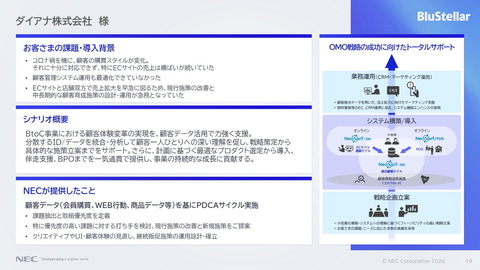 ダイアナでは、これらの改善施策を通じて、ECサイトにおける2回目の購買率を10%上昇させることを目指している。「ウェブのアクセス履歴をはじめ、お客さまの実態を分析し、どういった形で、どのタイミングで販促施策を打てばいいのかを、NECがサポートした。システムを提供するというだけの関係ではなく、システムを活用してお客さまの事業をどう拡大するのかといったところまで踏み込んでサポートしている。BluStellar Scenarioによって提供する価値を示すことができた」と述べた。