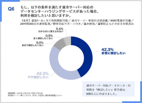そのため、液冷方式サーバーに対応したデータセンターハウジングの利用を検討する企業は84.6%に上り、専門性を外部に委ねたいというニーズが高まっていると分析。液冷サーバーの普及には、技術に加え、安全で確実な運用を支えるサービス提供の重要性が示唆されたとしている。