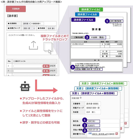 さらに、楽々Document Plusの画面上からファイルをドラッグ&ドロップでアップロードすると、生成AIが取引先名・日付・金額などを自動抽出して、属性項目へ入力できるようになった。従来の属性自動入力機能では、ファイルをファイルサーバーの指定フォルダに格納し、バッチ処理で自動抽出・入力して文書登録していたが、今回、ファイルのアップロードから文書登録までを楽々Document Plusの画面上で完結できるようになり、属性情報の自動抽出・入力もリアルタイムで行えるとのこと。