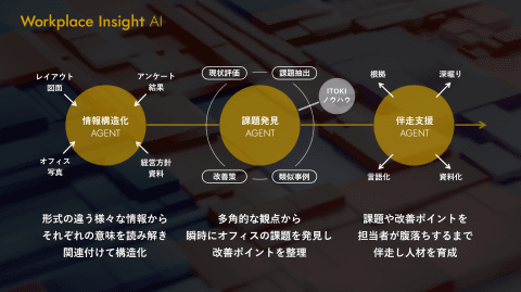 イトーキでは、オフィスや経営に関する活用すべきデータは急増し、分析が高度化・複雑化しているという背景を踏まえ、「AIがオフィスと働き方の経営判断を高度化ハイサイクル化する仕組みづくり」に本格的に着手した。160社を超えるデータドリブンなオフィス構築・運用の支援実績と、年間約3万枚におよぶ設計データや各種オフィスデータ、長年にわたり蓄積してきたオフィスデザイン・ファシリティマネジメントの知見を基盤に、AIと人の知恵を融合した新たなソリューションとして、ITOKI OFFICE AI AGENTSを開発した。