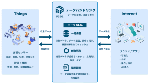 P3EGは、IoTデバイスにおける通信プロトコルやデータ形式の違い、通信時のデータ欠損やセキュリティ対策といった課題を解決するエッジコンピューティング・フレームワーク。センサーからデータの取得、補正、変換、サーバーへの送信、一時保管、再送までを一貫して管理できるため、ゲートウェイの個別開発が不要で、既存のサーバー資産を活用しながら柔軟にIoT環境を構築でき、初期コストの削減と導入期間の短縮を実現する。