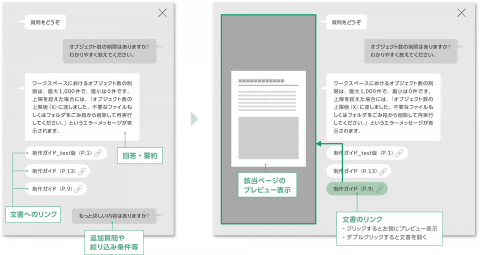 検索にヒットした複数の文書内の記述をAIが要約し、回答として提示する。これにより、文書を開かなくても、要約文を確認するだけで必要な情報を把握することもできる。また、回答の根拠となる文書の該当ページもプレビュー表示で容易に確認できるため、AIの回答を原文と照らし合わせることもできる。回答内容の正確性を担保しながら、誤情報の防止と迅速な情報検索を両立する。