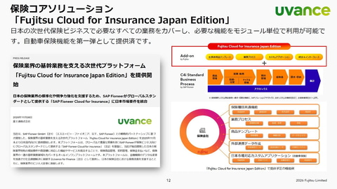 また、保険業界向けに、2025年11月から「Fujitsu Cloud for Insurance Japan Edition」の提供を開始。SAP Fioneerがグローバルスタンダードとして提供する「SAP Fioneer Cloud for Insurance」に、日本市場の要件を統合。日本の次世代保険ビジネスで必要なすべての業務をカバーし、必要な機能をモジュール単位で利用可能だという。現時点では、第1弾テンプレートとして、自動車保険機能を提供。今後、テンプレートの拡充に取り組むという。なお西田氏は、「テンプレートを活用することで、登山に例えると、1合目から登るのではなく3合目や5合目から登れるようになる」との表現で説明した。