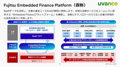 そのほか、「Embedded Finance」を実現する「Fujitsu Embedded Finance Platform(仮称)」の検討を進めていることも明らかにした。SaaSデータを活用し、企業の資金ニーズをAIが瞬時に検知。企業の事業活動に即したタイムリーな資金供給により、中堅中小企業の成長とサプライチェーンの持続可能性を支援できるという。現在、PoCのフェーズにあり、今後はEDIデータにとどまらず、ERP、CRM/SFA、HRTech、GHG可視化などのデータを集約し、さまざまなサービス提供へと拡大。B2B領域における「Embedded Finance」を提案する考えを示した