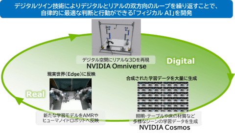 協業において、SCSKはオープンなロボティクスシミュレーションフレームワークであるNVIDIA Isaac Simや、オープンな世界モデルであるNVIDIA Cosmosを統合し、仮想環境における多様なシナリオに対して、物理的に高精度な学習データを大量に生成する。