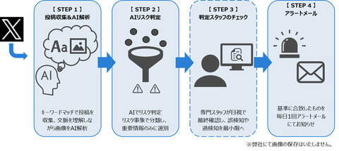 「画像リスク検知サービス」は、X(旧Twitter)を中心としたSNSに投稿される画像が、企業が販売する製品や企業そのものの評価に悪影響を与える可能性があるかどうかを判定し、リスクが確認された投稿について通知するもの。画像内の状況や文脈を言語化してリスク判定を行ったうえで専門チームによる目視チェックも実施し、確度の高い日次アラートのみを報告するという。