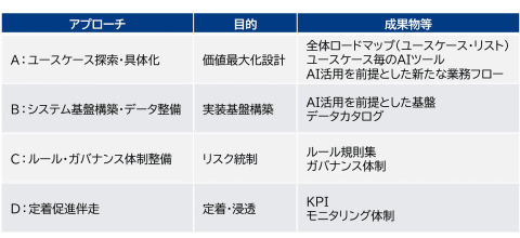 「ルール・ガバナンス体制整備」では、リスク管理、権限設計、品質担保など、AI活用に伴うルールなどを整備し、全社で継続的にAI導入・活用を推進するためのガバナンス体制を構築する。
