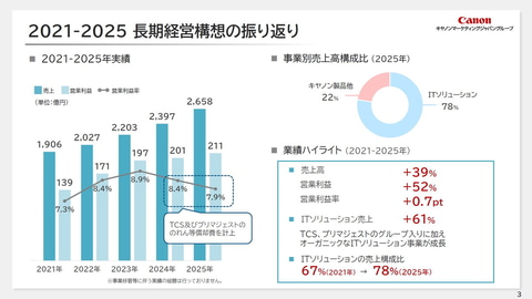 キヤノンMJエリアビジネスユニット長 上席執行役員の山口雅男氏は、「2021-2025 長期経営構想では、売上高、営業利益ともに順調に成長した。付加価値が高いITソリューション事業を伸ばし、生産性を高めて販管費を削減したことで、2025年度は過去最高益を達成している。ITソリューション事業の売上高は5年間で34%増加し、構成比は28%から35%に拡大した。PCやまかせてITシリーズ、セキュリティが増加している。ペーパーレス化の流れを受けて厳しい状況にあるプリンティング事業の収益を維持しながら、ITソリューション事業の拡大も進め、ビジネスを最大化し存在感を高める」とした。