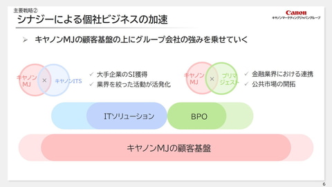 2つめの「シナジーによる個社ビジネスの加速」では、これまでは特定領域に限定していたキヤノンMJとキヤノンITSとのシナジー領域を拡大するとともに、プリマジェストとの連携もさらに強化する。