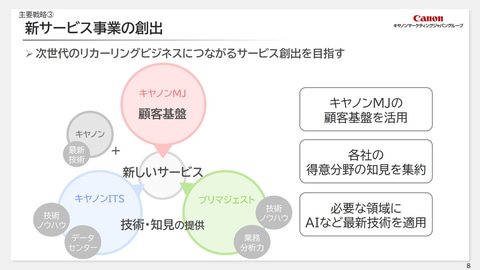 3つめの「新サービス事業の創出」においては、次世代のリカーリングビジネスにつながるサービス創出を目指す考えを示した。「キヤノンMJの顧客基盤、キヤノンITSのデータセンターおよび技術ノウハウ、プリマジェストの業務分析力、キヤノンの最新技術を組み合わせる。ひとつの集合体として、知識を結集し、さらに強いサービスを創出していきたい。業界に最適化したサービスを提供するほか、大手企業向けサービスや準大手・中堅企業向けサービスとして創出したものを、中小企業向けサービスにも展開していきたい」と述べた。