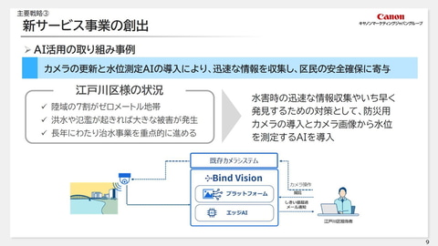 新サービスの事例として挙げたのが、江戸川区での取り組みだ。水害時の迅速な情報収集や、被害をいち早く発見するための対策として、防災用カメラの導入とカメラ画像から水位を測定するAIを導入。迅速に情報を収集し、区民の安全確保に貢献しているという。