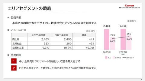 「エリア」セグメントでは、2028年度に売上高2450億円、営業利益250億円、営業利益率10.2%を目指す。