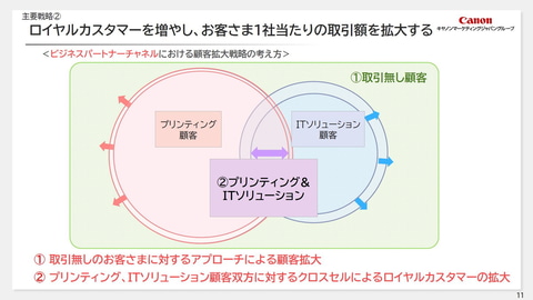 具体的には、キヤノンMJからの取引がない中小企業に対するアプローチを拡大するほか、プリンティング、ITソリューション顧客の双方に対するクロスセルにより、顧客1社あたりの取引額を拡大し、ロイヤルカスタマーを広げるという。