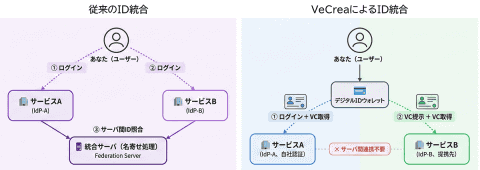 VeCreaは、ユーザーが自身のIDを基点に他サービスとのひも付けに同意する「ユーザー主導」の仕組みを採用することで、企業側の推測や判断に依存しないID統合を実現する。これにより、従来必須とされてきた名寄せ工程を大幅に削減し、導入期間の短縮、コスト抑制、プライバシー保護の強化を同時に支援する。