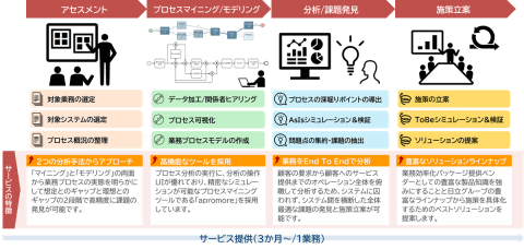 DX羅針盤サービスは、プロセスマイニングとビジネスプロセスモデリングを併用した手法を採用しており、両アプローチから業務プロセスの姿を漏れなく可視化する。特定のシステムにとらわれず、顧客の要求から顧客へのサービス提供までのオペレーション全体をスコープに入れた分析が可能になり、全体最適な課題を発見し、施策を立案できる。