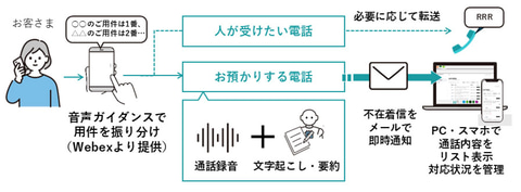 「おまかせAIでんわ」は、従来は人が応対していた電話をAIが一次受付し、用件をいったん預かることで電話応対の手間を削減するサービス。音声ガイダンスによって用件を振り分け、人が受けたい電話は必要に応じて転送する一方で、それ以外の電話はいったん預かることにより、電話応対業務の負担軽減を実現するという。