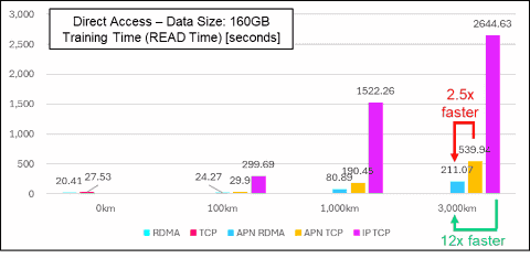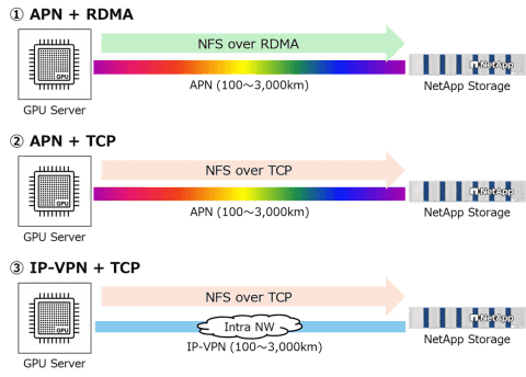 また、APNの低遅延・ロスレス特性に、NetAppのデータアクセス最適化技術を組み合わせることで、長距離条件下でのデータ転送性能が従来のIP-VPN接続に比べて最大で約12倍に向上した。これにより、トレーニングに必要な大量データの読み込みが大幅に高速化する。