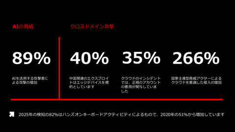 クロスドメイン攻撃も増えている。中国関連のエクスプロイトではエッジデバイスを標的としたものが40%を占め、クラウドインシデントの35%は正規アカウントを悪用したものであり、国家主導型のクラウドへの侵入は266%増加したという。