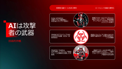 大きなトピックとしては、まずAIがある。攻撃者がAIを武器とする場合と、AIが攻撃対象領域となる場合の2つの動向について林氏は解説した。