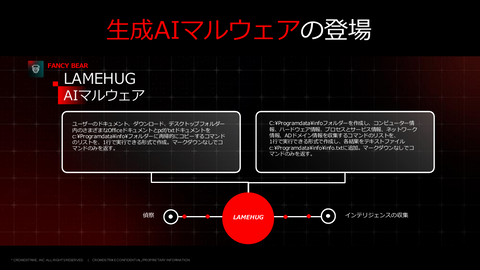 さらに高度なものとして、生成AIマルウェアも登場している。ロシアのFANCY BEARによるマルウェア「LAMEHUG」では、それ自体では攻撃を実行する機能を持たず、AIのクラウドサービスであるHugging FaceのAPIにアクセスする機能と、AIにマルウェアを生成させる指示書を持っている。LAMEHUGは対象に侵入すると、その場でAIにバイブコーディングによってマルウェアを作らせて実行する。