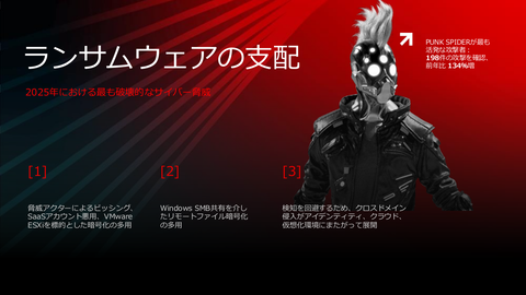 まずは、ランサムウェアが支配的な(サイバー犯罪はランサムウェア一辺倒という)状況だ。中でも活発だったのがPUNK SPIDERという攻撃者で、前年比138%増の198件の攻撃が確認された。
