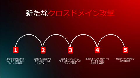 2つめは、クロスドメイン攻撃の新たな傾向について。エッジデバイスなど管理対象外のデバイスを経由して侵入するケースが多いこと、正規の認証情報で横展開するため攻撃かどうかわかりにくいという回避的な行動、SaaSやシングルサインオン(SSO)へのアクセス取得、仮想環境上への攻撃環境の構築、といった手法を林氏は取り上げた。
