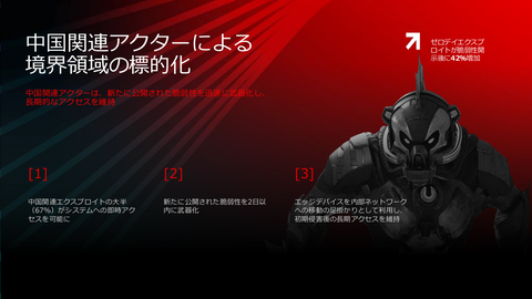 続いて、中国関連アクターが、外と中との境界領域を標的にしている傾向について。特にエッジデバイスを足がかりとして内部ネットワークに侵入するケースが増えているという。エッジデバイスではモニタリングが行われることが少なくインシデントの長期化につながると林氏は説明した。