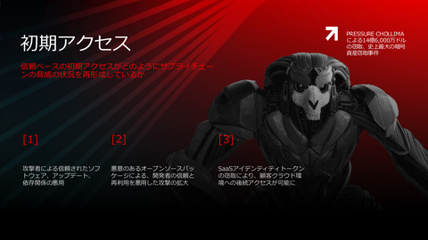 次は、サプライチェーン攻撃による初期アクセス(入り口)について。取引先などから信頼に基づいて侵入や横展開するケースや、あるソフトウェアが内部で利用している別のソフトウェアを悪用したソフトウェアサプライチェーン攻撃、SaaSのアクセストークンの窃取を林氏は紹介した。
